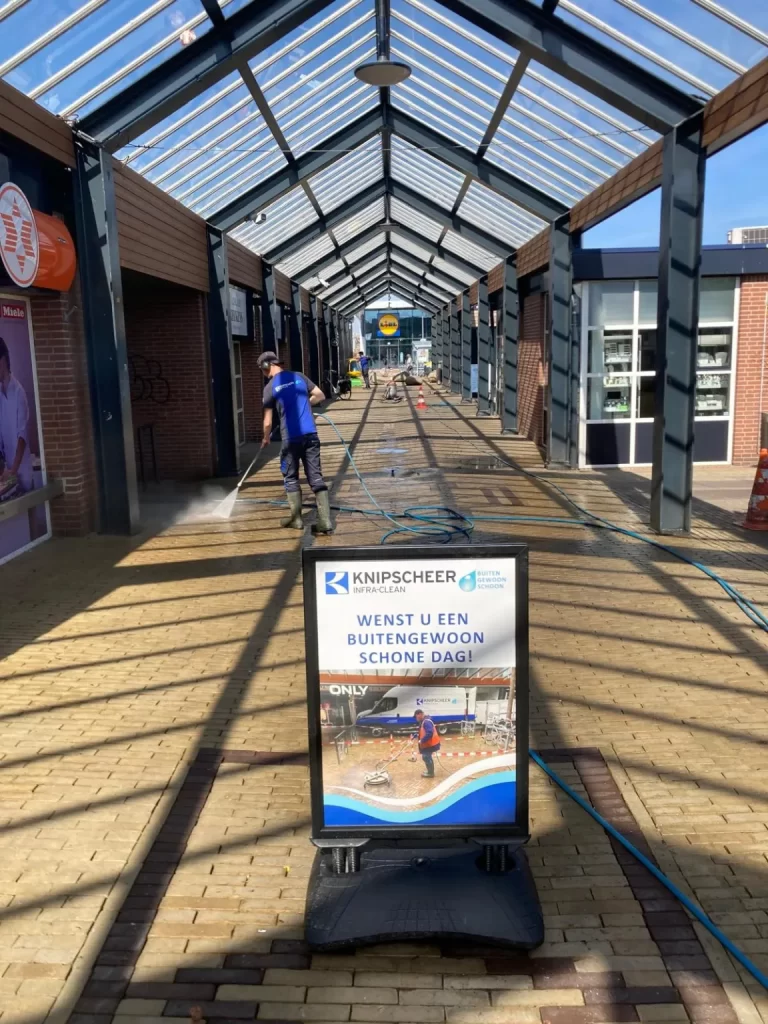 In april 2025 is in opdracht van de Gemeente Oldebroek de bestrating in het winkelcentrum van Wezep weer eens gereinigd. Het winkelend publiek wordt door de medewerkers van Knipscheer Infra-clean een buitengewoon schone dag toegewenst. Het resultaat mag er zijn toch?